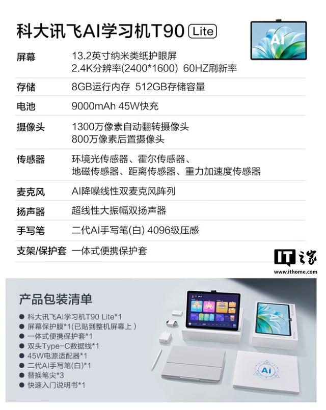IT之家 3 月 2 日消息,科大讯飞现已在京东上架 T90 Lite 学习机,该机匹配 13.2 英寸屏幕,主打 1 对 1 作业辅导、AI 学习,定价为 7999 元,首发价 7799 元。
