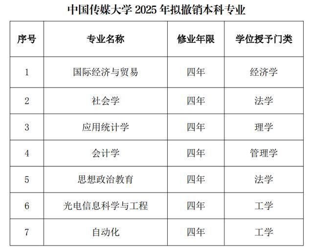 IT之家查询中国传媒大学官网公告发现,该校 2025 年拟撤销本科专业包括国际经济与贸易、社会学等 7 个专业。结合发言来看,预计该校 2026 年招生将一口气砍掉最新披露的 16 个本科专业和方向。