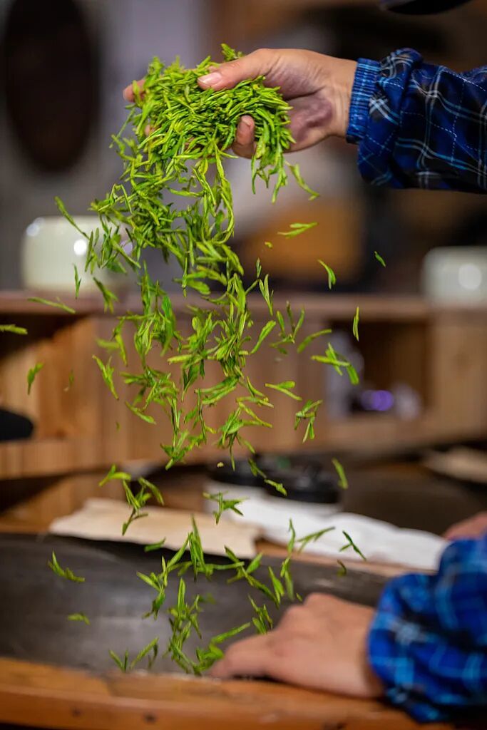 炒茶坊内,经验丰富的老师傅凝神运掌,青叶入锅刹那,手法如太极流转。