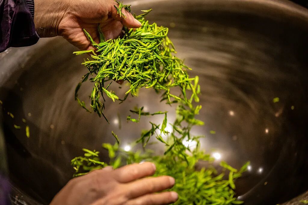 非遗传承人遵循“抖、搭、拓、甩”古法炒制,滚烫的铁锅中每一次翻飞,都将春日的鲜嫩锁入扁平挺秀的叶形,成就“杯中芭蕾”的视觉与味觉盛宴。