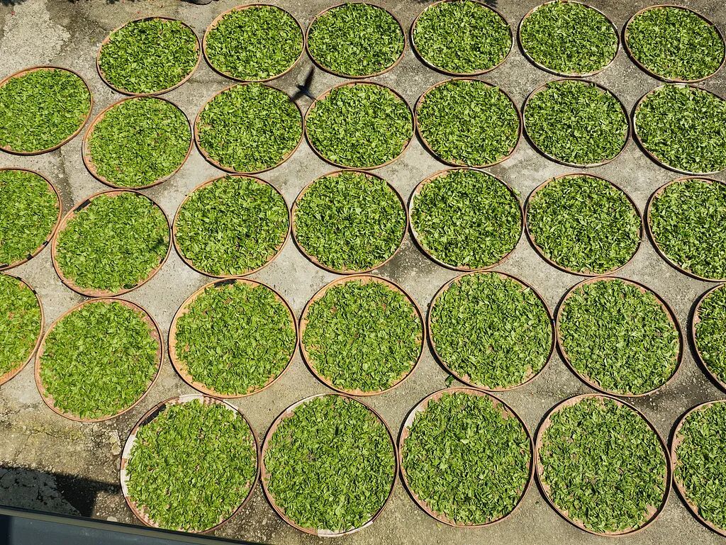 采下的鲜叶平铺于竹箕,入摊青架等待自然萎凋。
