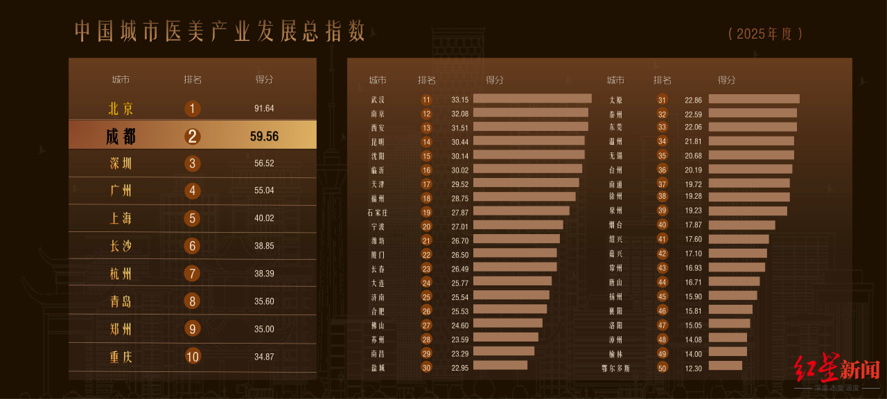 其中,成都凭借全产业链协同优势,不仅在副省级城市组中位居榜首,更以59.56分的总成绩稳居全国第二(仅次于北京),较上一年度排名攀升,位列中国医美产业头部第一方阵,高质量发展态势持续凸显。