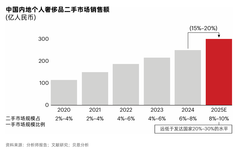 消费升级与理性消费的双重趋势下,二手奢侈品行业正成为中国消费赛道的“新蓝海”。 据贝恩公司数据显示,2025年中国内地个人奢侈品市场收缩3%—5%,而二手奢侈品市场仍保持着15%至20%的强劲增长。