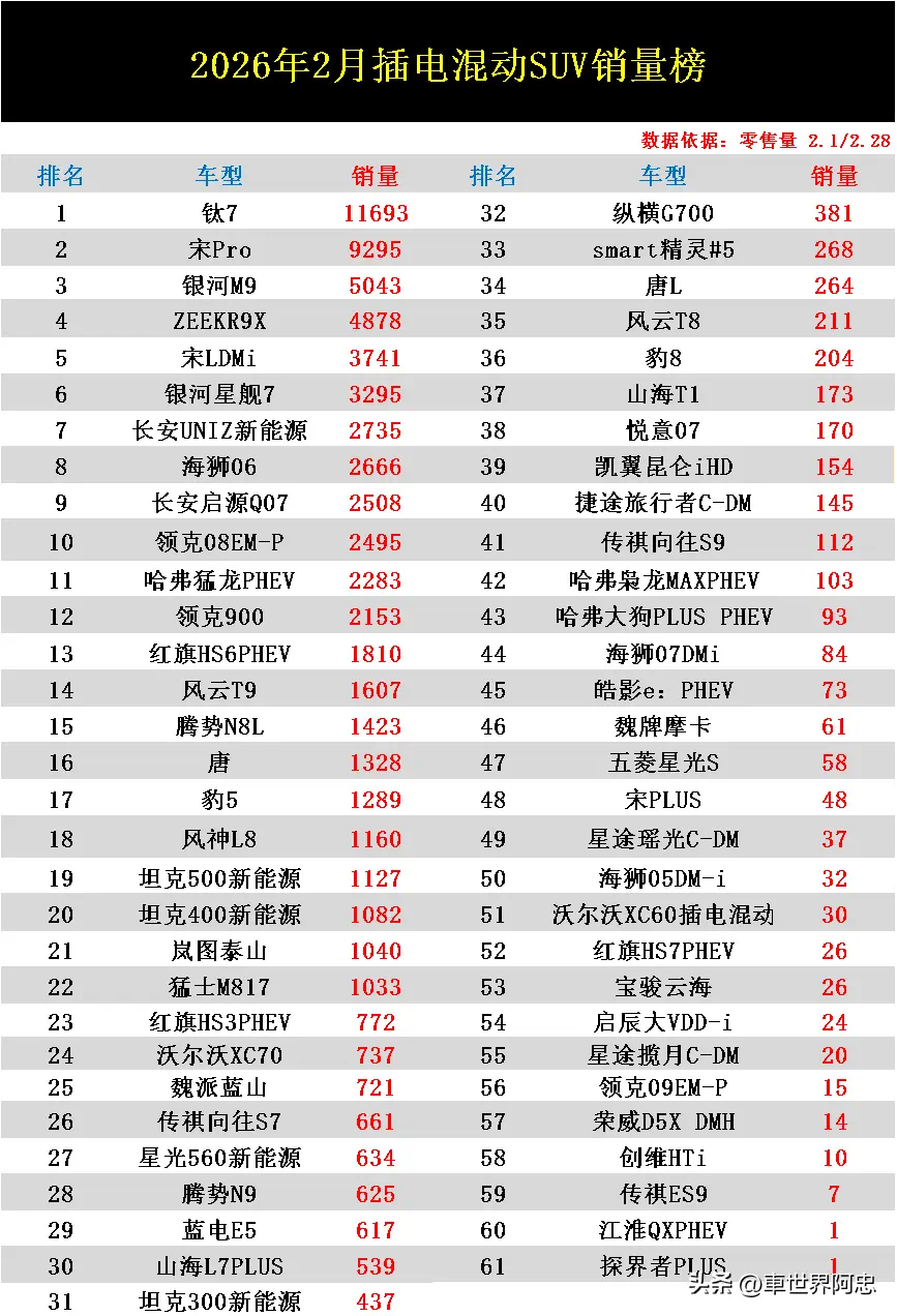 导读:插电混动SUV凭借可油可电以及超长续航等诸多优势而逐渐热销。特别是近几年,在燃油价格居高不下的情况下,使得部分有续航焦虑以及担心油耗高的消费群体有了更加丰富的选择。根据乘联会日前公布的插电混动SUV零售量排行榜数据显示,2月份虽然处于春节放假期间,但整体市场销量仍然保持较高的热度,在上榜的61款车型里面,依然有接近半数的车型月销量突破千辆大关。其中方程豹钛7以11693辆的成绩蝉联销量冠军的宝座,同时也是榜单里面唯一突破万辆大关的车型。银河M9销量急速攀升,荣获榜单第3名,宋LDMi、海狮06、领克08EM-P紧随其后,排名都名列头部。值得一提的是,以往插电混动SUV市场的销量主力豹8与宋PLUS表现已大不如从前,在榜单中排名均跌至35名开外。2月插电混动SUV销量排名!钛7意外登顶,银河M9季军,宋PLUS第48
