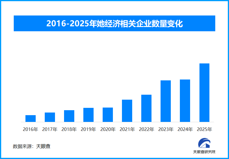 天眼查专业版数据显示,截至目前我国现存在业、存续状态的“她”经济相关企业超942.3万家。其中,2026年新增注册相关企业22.7万余家,从企业注册数量趋势来看,近十年间,“她”经济相关企业的注册数量呈现出逐年增长的态势,并在2025年达到顶峰。