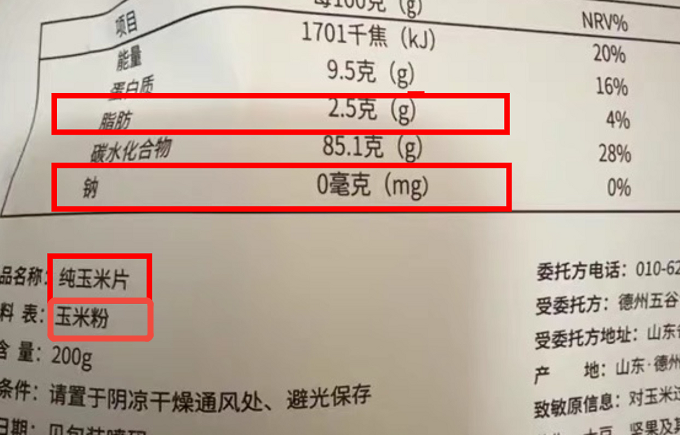 ✅避坑指南:选以全玉米粉或多种谷物(如燕麦、糙米等)为主要成分的产品,脂肪含量 <10g/100g ,钠含量 <300mg/100g 。