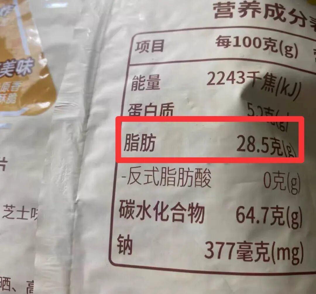 有些产品的脂肪含量甚至能高达28g以上,吃一包,热量和脂肪可能比吃一袋薯片也低不了多少。